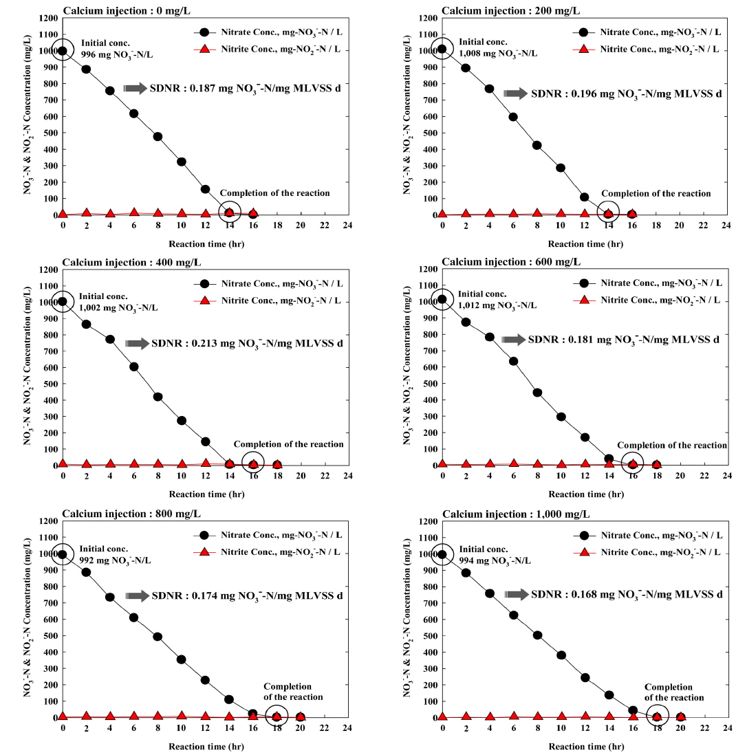 Oh et al. (2002)의 칼슘이온 농도에 따른 탈질 반응 변화에 관한 연구결과에 따르면 칼슘이온의 농도별 주입 조건(15, 200, 500, 800, 1,200 및 1,500