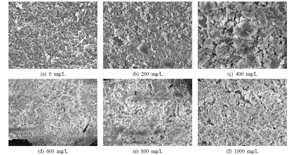 mg/L)에 따른 질산성 질소의 탈질 반응은 500 mg/L까지는 SDNR 값이 0.218에서 0.256 mg NO3--N/mg MLVSS·d로 증가하다가 800 mg/L부터 1,500 mg/L까지는 0.194에서 0.165 mg NO3--N/mg MLVSS·d로 감소하는 경향을 나타내 본 연구와 유사한 결과를 나타내고 있었다. 또한 이에 대한 원인을 첨가된 칼슘이온에 의해 표면전하가