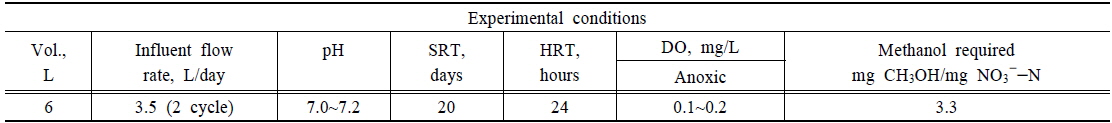 본 연구에 사용된 반응기의 구성 및 형태는 Fig. 1에 나타내었으며, 실험실 규모 SBR 반응기를 이용하여 조건별 실험에 따른 질산성 질소의 제거효율을 평가하였다. 반응기의 체적은 6 L로 설계하였으며,