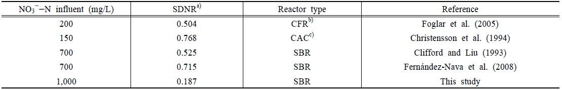 Table 5에는 메탄올을 탄소원으로 이용한 탈질 반응시의 SDNR 값을 조사한 기존의 연구와 본 연구결과를 비교한 결과를 나타냈다. 비교 결과, 기존의 연구에