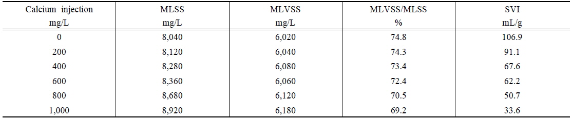 SVI 값은 각각 106.9, 91.1, 67.6, 62.2, 50.7 및 33.6 mL/g으로 나타나 칼슘이온의 주입량이 증가할수록 SVI 값은