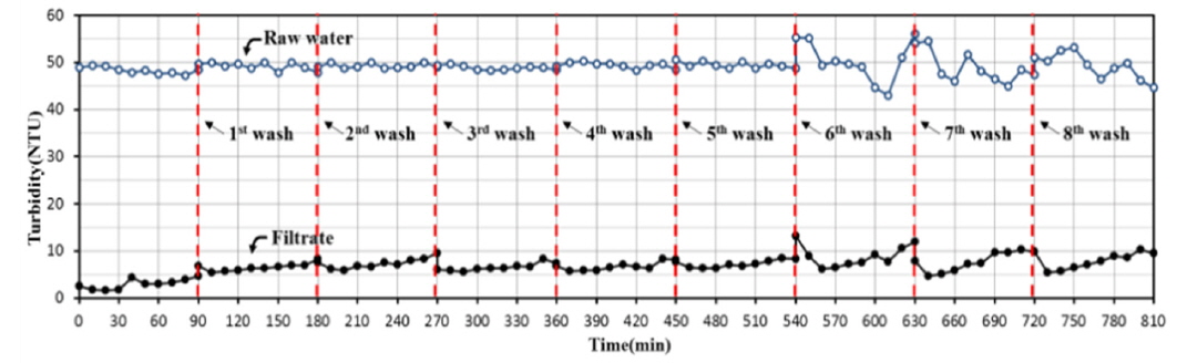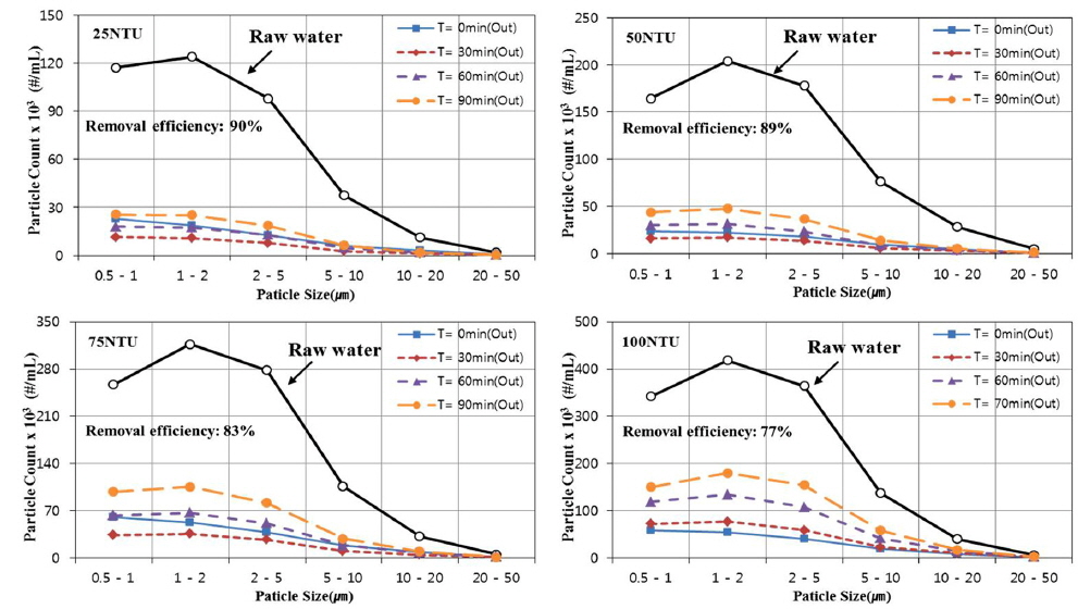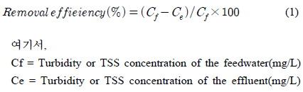 m/day, 유입원수의 농도 50NTU에서 약 90%의 여과효율을 보였다.