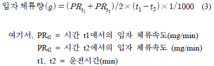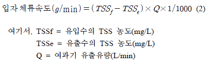 산출된 TSS농도를 바탕으로 여과장치의 입자 체류속도는 다음 식 (2)를 이용하여 산정하였으며 여과시간에 따른 입자 체류량은 식 (3)에 의해 산출하였다.