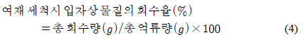 또한 한계 체류량 도달 후 여재 세척시 발생하는 입자상 물질의 회수율은 식 (4)와 같이 총회수량을 총 체류량으로 나누어 산출하였으며 총회수량은 각각의