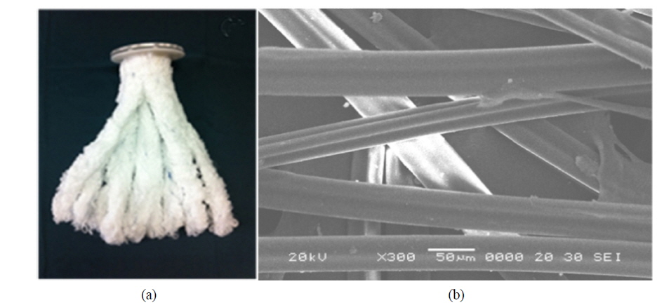 만든 여재로 Fig. 2(a)에 보는 바와 같이 선형다발 형태(line bundle shape)이며 여재의 표면은 (-) 성질의 전하를 띠고 있다. 직경은 약 4 cm이며 공극율은