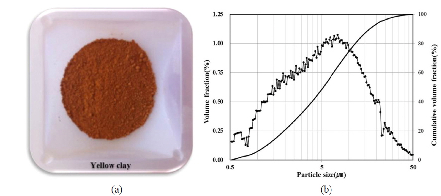 유입원수는 일반적으로 의류 및 직물을 염색하는데 사용하는 50 μm 이하의 상업용 황토를 수돗물과 희석하여 제조한 인공탁수를 사용하였다. Fig. 3에는 실험에 사용된 황토분말을 보여주고 있으며 입도분포를 분석한 결과 80%이 상이 10 μm 이하의 미세한 입자로 구성되어 있다.