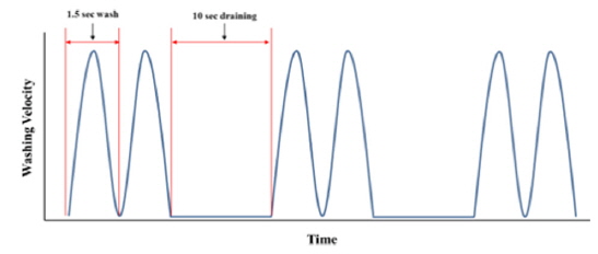 Fig. 5에는 본 실험에 사용된 간헐적인 충격 세척법의 모식도를 나타내고 있다. 그림과 같이 연속적으로 1 L씩 2회의 고속세척(세척속도= 세척유량/면적=