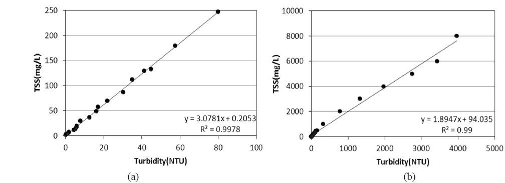 Fig. 6은 고형물 기준의 여과효율 산출을 위해 탁도와 TSS의 관계식을 도출하였다. 80NTU 이하의 유입수, 여과수, 저농도의 세척수에는 Fig. 6(a) 식을 이용하여 TSS 농도로 환산하였고 80NTU 이상의 고농도 세척수에는 Fig. 6(b) 식을 이용하여 TSS를 산출하였다. 산출된 TSS를 바탕으로 다음과 같이 여과효율을 평가하였다.