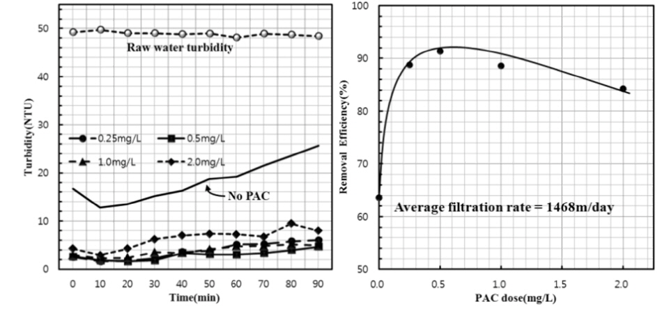 m/day, 50 NTU)에서 0, 0.25, 0.5, 1.0, 2.0 mg/L의 PAC를 주입하여 실험한 결과 최적의 주입농도는 0.5 mg/L로