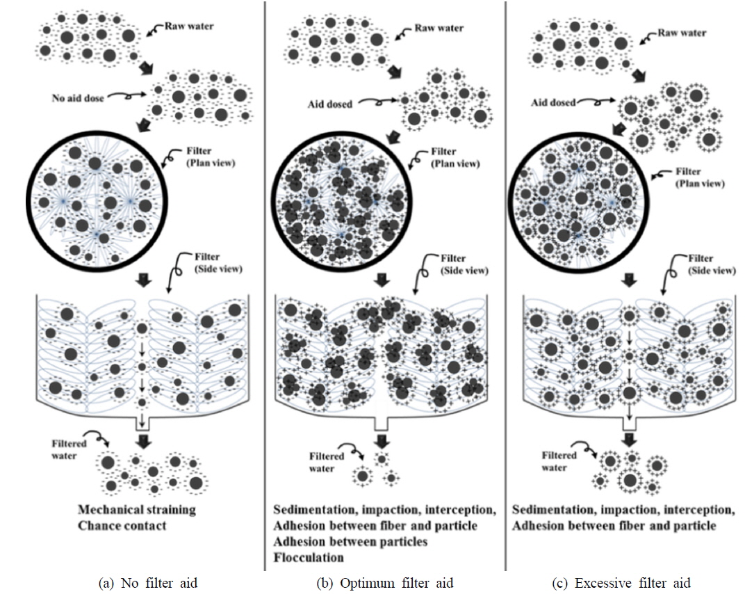 따라서 일반적인 심층여과지의 간극이나 공극에서 일어나는 충돌, 침전, 확산, 성장, 응결 등과 같은 기작은 일어나지 않고 여과지로 유입되는 입자 중
