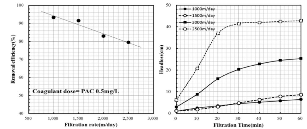 유입수 탁도 및 여과속도 조건에서(50NTU, 1,500 m/day) 0.25 ~ 2.0 mg/L의 주입농도로 운전하였다. 또한 여과속도, 유입수