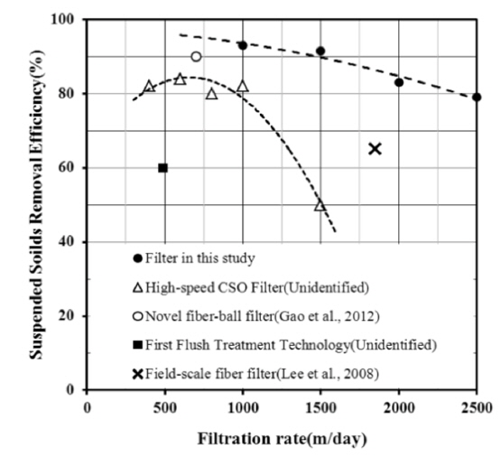 섬유필터 연구를 수행한 Kim et al. (2014)의 연구결과와 비교하였을 경우에도 고속여과속도(본 연구 1,500 m/day, 비교연구 1,180 m/day)에서 20% 정도의 우수한 효율을 보였다.