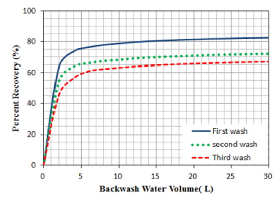 여과시험 횟수가 증가함에 따라 여과장치의 회수율이 감소하였는데 그 이유는 초기 세척 시 제거되지 않고 남아있는 억류물질 부착부위에 추후 운전에서 재차