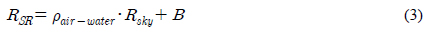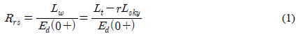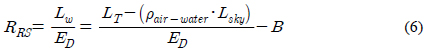 Lw는 순수하게 물에 의해서 복사되는 복사량, Lt는 물에서 복사되는 전체 복사량, Lsky는 대기에서 입사되는 복사량이며, Ed(0+)는 아래 방향으로 입사되는 복사조도를 수표면 바로 위에서 측정한 값으로 다음의 식으로 표현 가능하다. ρp는 반사판을 이용해 측정한 기준 반사율이다.