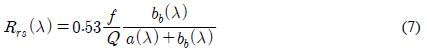 보통 물에서의 원격반사도는 아래 식 (7)로 표현 가능하다 (Gordon et al., 1988). 식 (7)에서 bb는 후방산란계수, a는 흡수계수, f는 입사광의 각도에 관련된 상수이며, Q는 BRDF (Bidirectional Reflectance Distribution