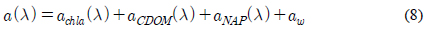 무시하는 경우가 많다. 또한 총 흡수계수는 조류와 순수한 물, CDOM, NAP에 의한 흡수의 합이라고 가정하였다. 아래 식에서 achla는 조류에