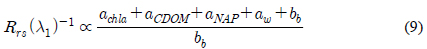 일반적으로 녹색 및 청색파장대의 반사율은 Chl-a 뿐 아니라 CDOM에 의한 흡수와 NAP에 의한 흡수, 산란의 영향을 받고 있어 녹색 및 청색