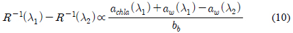식 (10)에서 두 번째 파장의 선택으로 CDOM 및 NAP에 의한 영향은 최소화 했지만 여전히 후방산란에 의해 영향을 받고 있음을 알 수 있다.