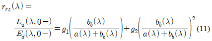 많은 연구들에서 식 (11)의 이차항을 생략함으로써 원격 반사율과 흡수, 산란의 관계를 식 (12) 또는 식 (13)으로 단순화시켜 사용해왔다(Brando and Dekker, 2003; Giardino et al., 2007; Hakvoort et al., 2002; Hoogenboom et al., 1998; Jupp et al., 1994; Kutser, 2004; Kutser et al., 2009; Zhang et al., 2009).