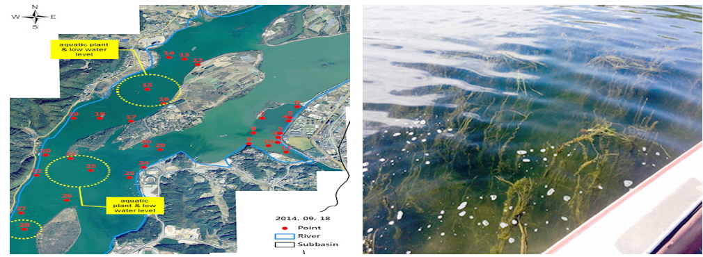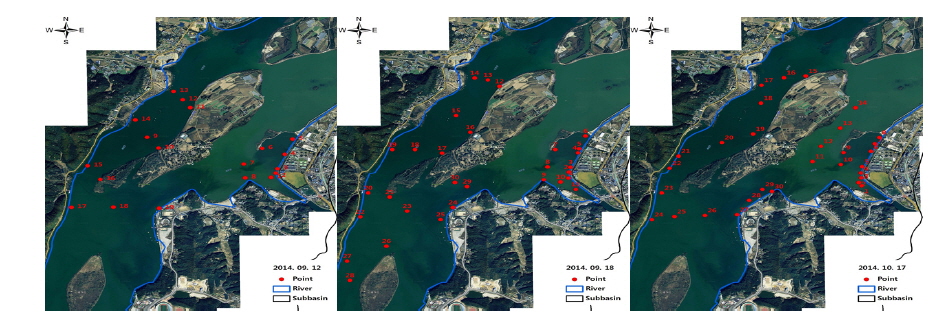 Chl-a 농도 추정모형 적용을 위해 1차(18개 지점, 2014. 9.12), 2차(30개 지점, 2014. 9.18), 3차(30개 지점, 2014.