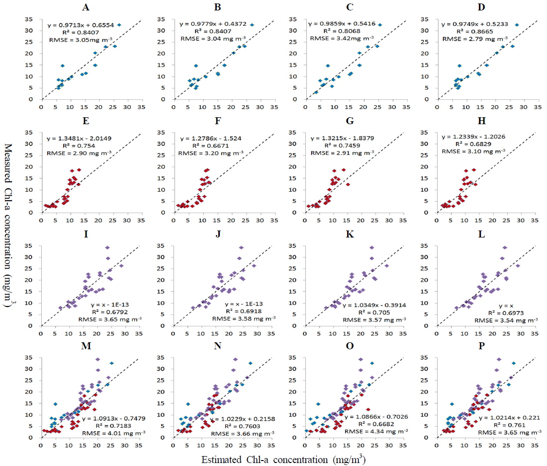 0.65에서 0.88까지 변화를 보였고 RMSE는 2.25 mg/m3에서 4.34 mg/m3까지 값을 보여 전반적으로 실측된 Chl-a 농도와 비슷한 추정결과를 보였다. 또한, 1차, 2차, 3차 및 전체 측정자료에 적용된 각각의 Chl-a