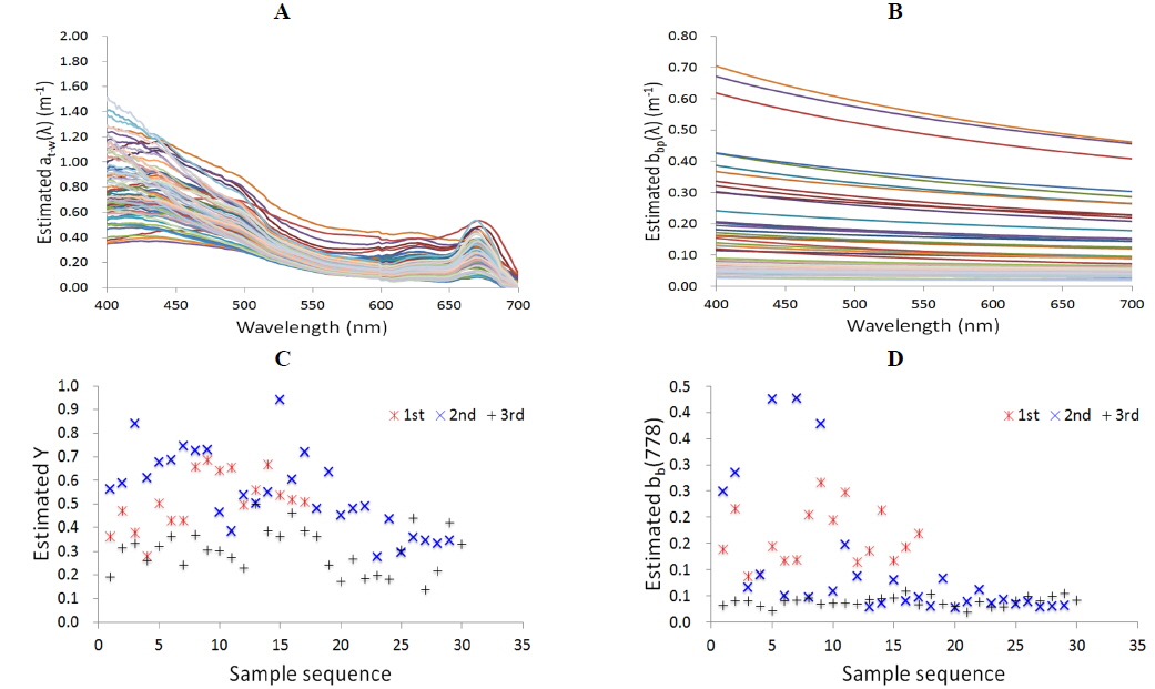 끝으로 현장에서 측정된 AOPs를 이용해 IOPs를 계산한 결과, 비슷한 시기의 짧은 기간 동안에 측정된 자료로 인해 큰 변화를 보이지 않았으며,