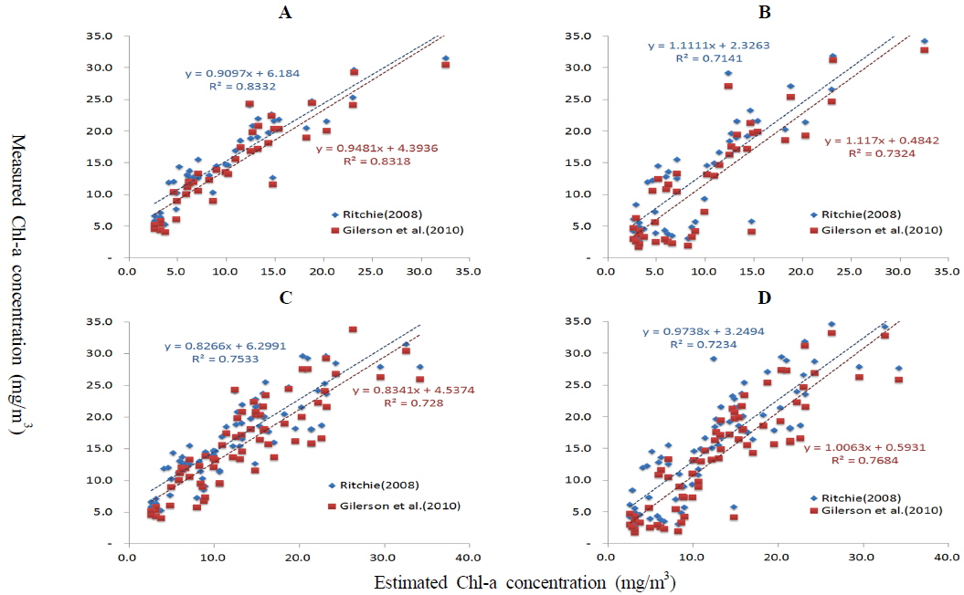 최종적으로 Ritchie (2008)가 제안한 식 (표 1, 6-1)과 Gilerson et al. (2010)이 제안한 식 (표 1, 6-2)으로부터 의 암호의 Chl-a 농도를 추정하고, 그 결과를 3-band 모형과 비교하였다.