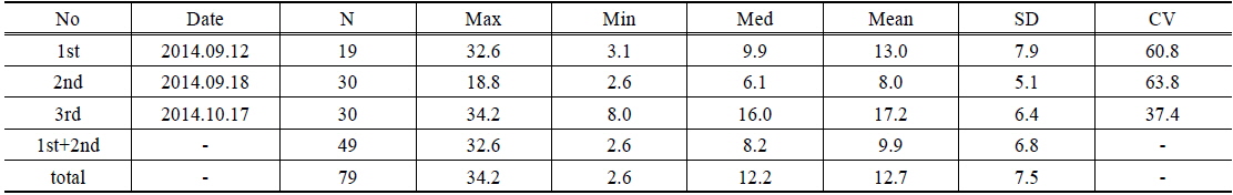 10 mg/m3 이하인 경우에는 Chl-a 추정 모형의 오차에 의한 불확도가 증가하는 것으로 알려져 있지만 3차 측정된 Chl-a의 최소 농도가 8 mg/m3으로 1, 2차 측정자료에 비해 상대적으로 높아 오차에 의한 불확도가 낮게 나타났다.