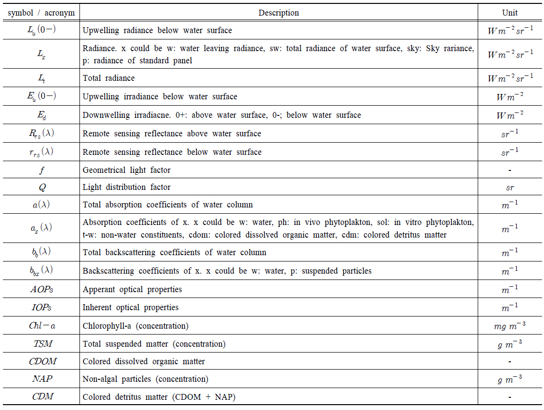 수체를 구성하는 물질의 농도를 원격탐사 기법을 이용해 추정하기 위한 많은 방법들은 기본적으로 원격반사도(Rrs(λ))와 흡수(a(λ)), 산란(bb(λ))과 같은 고유광특성 (Inherent Optical Properties, IOPs - 편의를 위해 본 논문에서 사용된 기호 및 약어표를 부록에