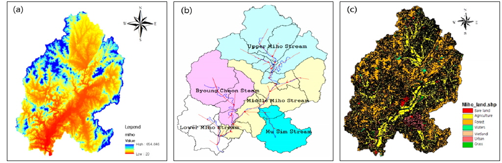 시스템(WAMIS)에서 제공되는 수치지형자료를 활용하여 WARMF에서 사용되는 방식으로 변환하여 사용하였다(Fig. 3(c))(Han River Flood Control Office, 2013). 기상데이터 구축을 위해 기상청에서 제공하는 청주측후소의 6가지(강수량, 최저기온, 최고기온, 이슬점 온도, 대기압, 평균풍속) 일별 기상자료를