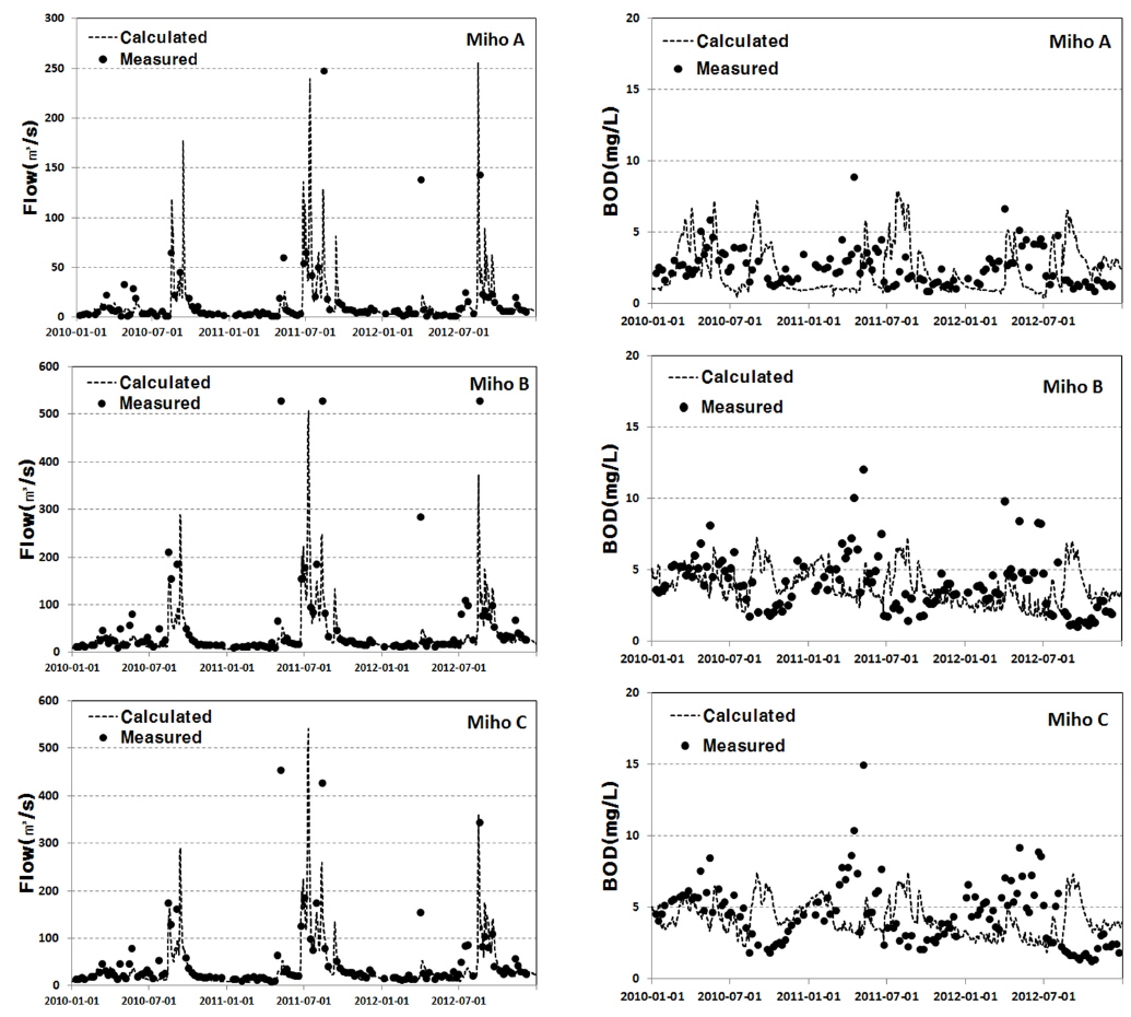 수질보정 결과 유역 말단인 미호C 지점에서 BOD의 RMSE가 보정 시 1.39 ~ 2.45, 검정 시 2.19 ~ 4.43으로 양호하게 나타나 WARMF