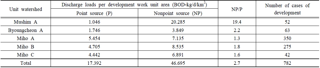 최근 5년간 미호천유역의 개발사업 협의 건수는 782건이며, 개발사업의 단위면적당 배출부하량을 살펴보면 점 배출부하량보다 비점 배출부하량이 약 2.7배