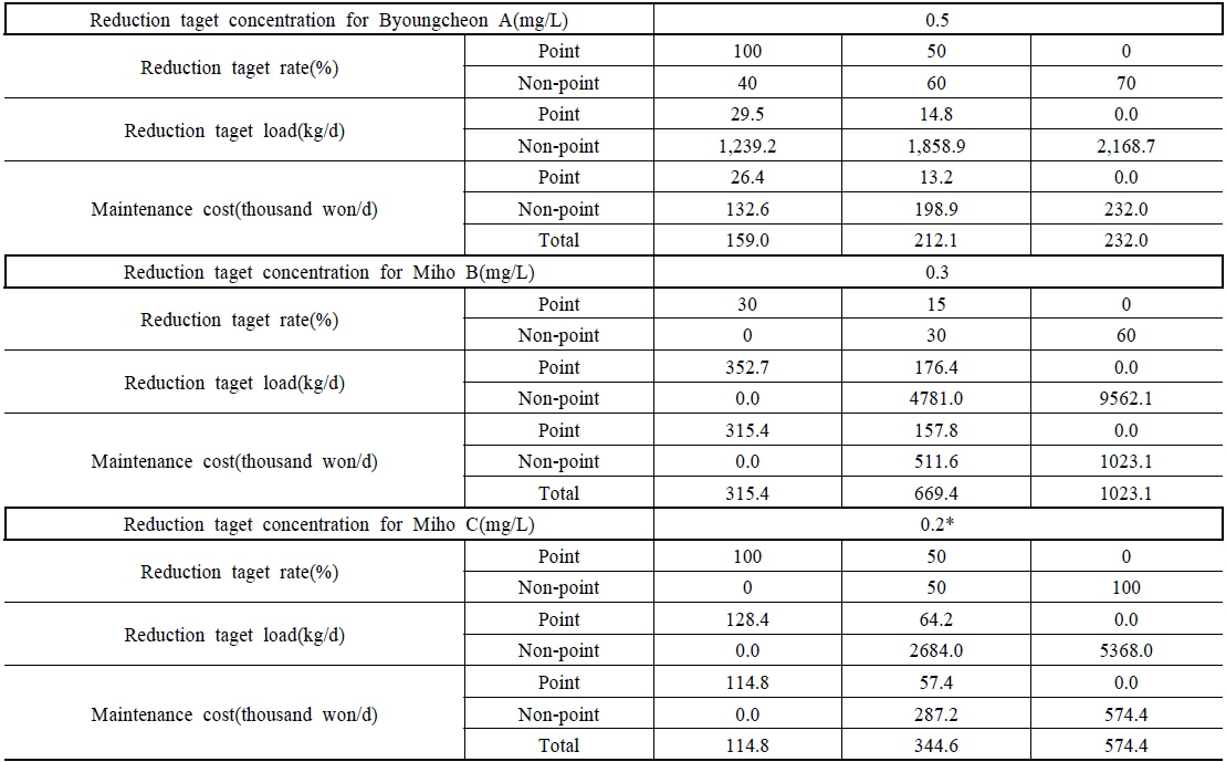목표수질 2.3 mg/L를 달성하기 위해서는 0.5 mg/L이상의 수질개선이 가능한 배출부하량삭감이 이루어져야 하며, 미호 B와 C의 경우 목표수질