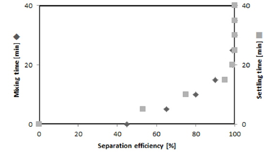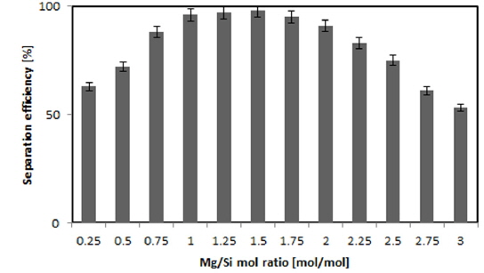 Separation efficiency by various Mg/Si mol ratio(C. vulgaris concentration 4.35 g/L, pH 10, mixing time 20 min, settling time 20 min)