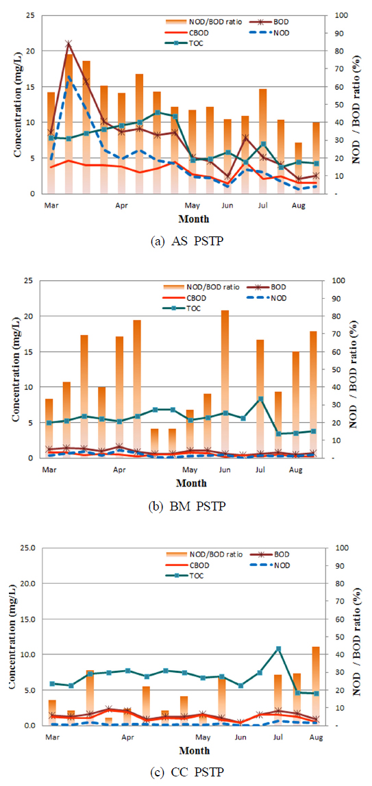 안정적으로 처리하였다 하더라도 불완전한 질산화로 인한 방류수의 NOD가 발생되어 BOD농도가 상승할 수 있음을 알 수 있다. TOC와 관련하여 같은