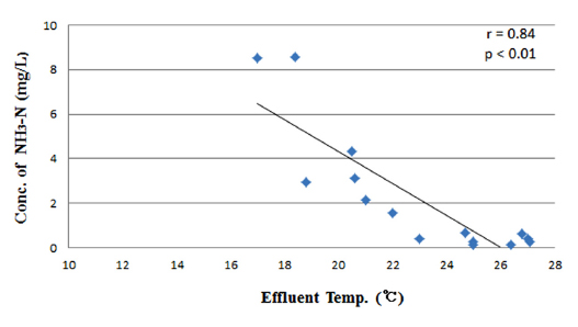 수온에 따른 NOD 비율의 영향을 파악하기 위하여 상관성이 가장 뚜렷하게 나타난 AS 시설에 대한 방류 수온과 NH3-N 농도와의 상관관계를 분석하여 Fig. 4에 나타냈다. 3월에서 8월까지의 AS시설의 방류수온은 17~27℃로 동절기 기준 12℃이상이었다. 조사기간 동안 수온이 오르면서 NH3-N와 NOD가 점차 낮아지는 음의 관계를 나타냈다. (r=0.84, p<0.01) 이는 수온 저하로 인한 질산화 및 탈질반응의 둔화 현상(Kim et al., 1997) 때문에 봄철 NH3-N가 높게 배출된 것으로 판단된다.