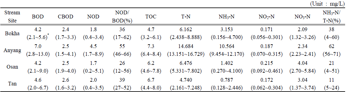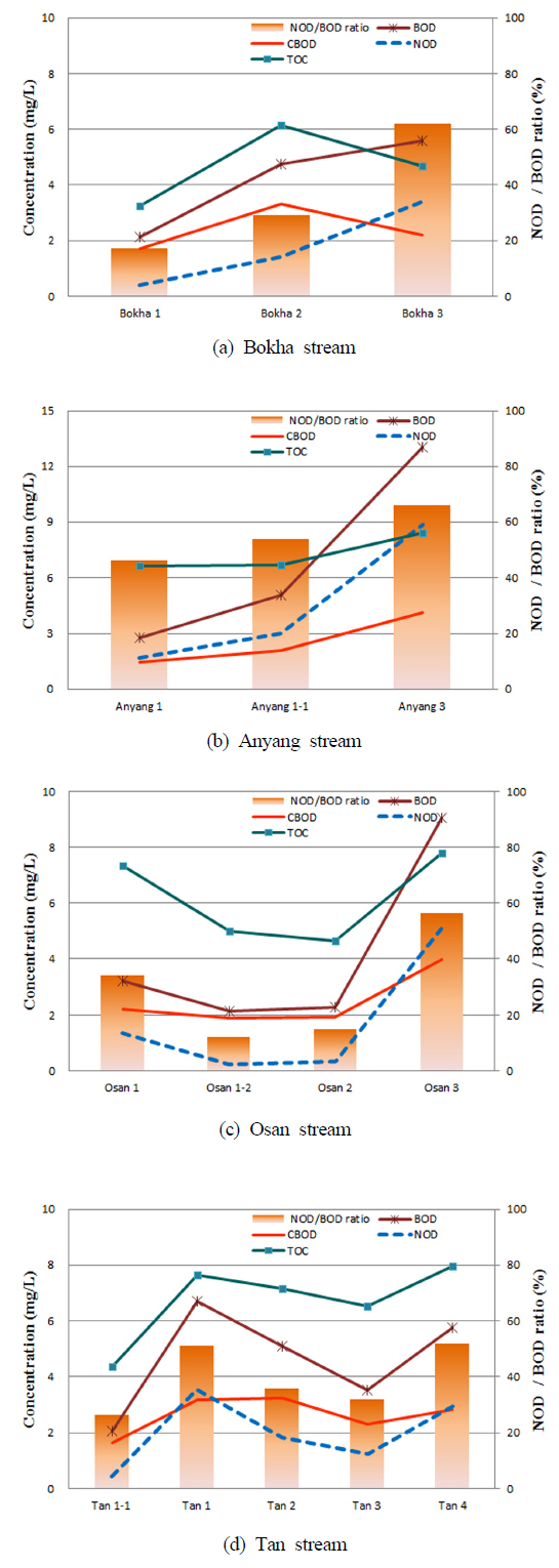 하천에서 CBOD와 TOC는 일정한 값을 보이거나 그 변동폭이 적었으나 NH3-N 농도가 높은 하천과 각 지점에서는 상대적으로 높은 NOD값과 NOD/BOD 비율을 보이면서 BOD 농도에 영향을 주었다. 인구과밀 지역의 도심하천인