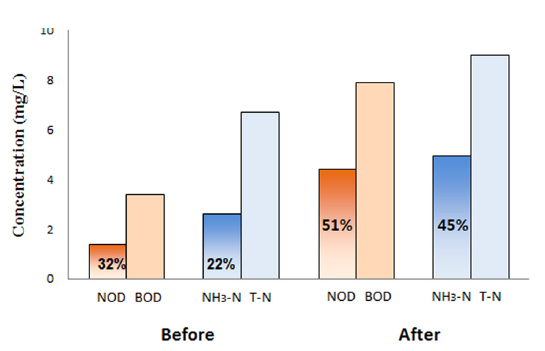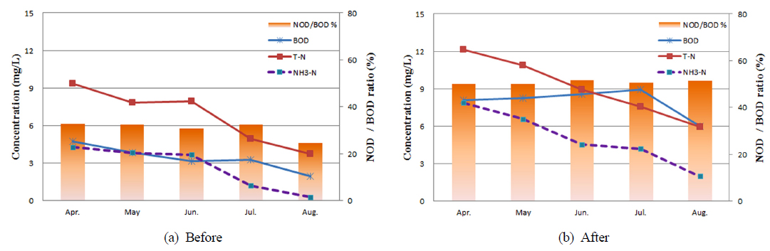 있어 NOD (질소화합물의 산화 분해에 의한 산소 소모, nitrogenous oxygen demand)가 발생할 가능성이 크다. 따라서 NH3-N가 높은 농도로 존재할 경우 방류수의 BOD 기준을 초과할 우려가 있으며 이는 수용하천에도 영향을 미친다(Min et al., 2011).