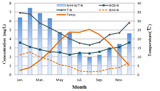 농도상승이 나타났으며 특히 무기질소 중 NH3-N (암모니아성 질소)가 높은 농도를 보이면서 하천 수질에 영향을 주는 것으로 나타났다(Shin et al., 2000; Sung et al., 2010).