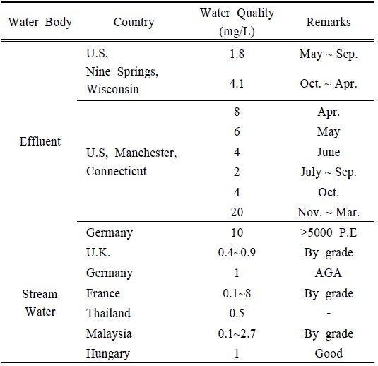이와 관련하여 하수처리시설의 TOC의 병행 적용 방안이 연구(Byun et al., 2010; Jeong et al., 2014)되고 있으며 하천수질과의 연계성있는 난분해성 유기물질 평가를 위해서 공공하수처리시설 방류수의 TOC 농도를 조사할 필요성이 제기되고 있다.