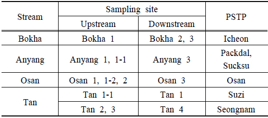 및 하천에 위치한 공공하수처리시설 현황을 Table 3에 나타냈다. 공공하수처리시설 방류수의 영향을 직접 받는 지점은 Bokha 2, Anyang 3, Osan 3, Tan 1, 4지점이다. 공공하수처리시설