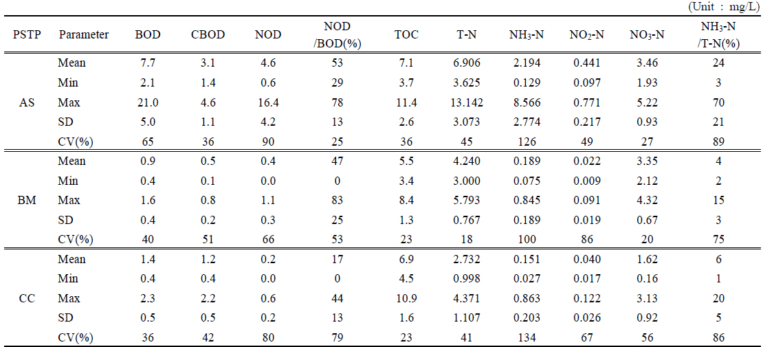 채취 시료는 유기물 관련 항목으로 BOD, CBOD, TOC와 질소염류 항목으로 T-N, NH3-N, NO3-N, NO2-N를 분석하였다. 모든 항목은 수질오염공정시험기준(MOE, 2011)에 따랐으며, BOD 시험시 질산화균 억제제로 ATU(1-Allyl-2 thiorea) 40 mg/L을 첨가 후 식종하여 CBOD값을 구하고, BOD에서