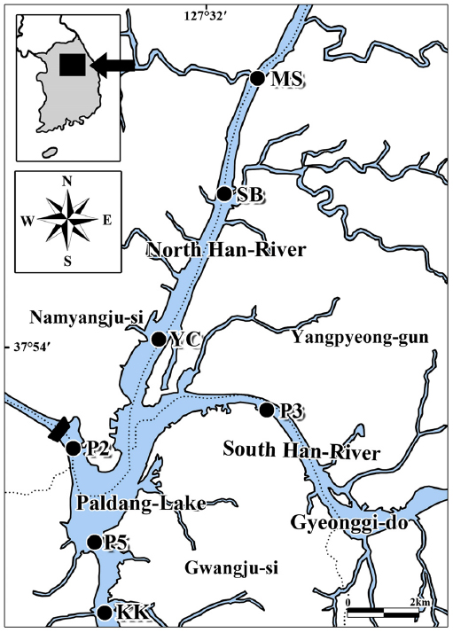 경기도 남양주시 조안면 능내리 팔당댐, P5: 광주시 남종면 분원리, KK: 광주시 퇴촌면 광동리 광동교)을 대상으로 수행하였다(Fig. 1).