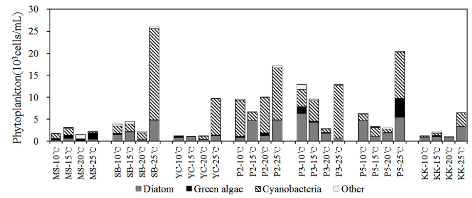 전 지점의 주요 출현종은 Phormidium tenue, Pseudanabaena limnetica, Oscillatoria tenuis, Microcyctis aeruginosa, Cyclotella atomus, Nitzschia actinastroides, Aulacoseira ambigua 등으로 대부분 남조류와 규조류였으며, 녹조류는 출현빈도가 낮았다. 북한강의 묵현천(MS)은 10~15℃의 배양조건에서 사상성 남조류인 Phormidium tenue가 39.2~58.1%의 범위로 우점 하였으며, 규조류인 Cyclotella atomus가 11.7~15.0%로 아우점종으로 출현하였다. 20℃ 조건에서는 황색편모조류의 Mallomonas sp.가 25℃ 조건에서는 녹조류인 Micractinium pusillum이 우점종으로 출현하였다(Table 3). MS의 현존량은 모든 조건에서 3.5×103 cells/mL 이하로 낮았으며, 수온이 높을수록 녹조류의 현존량이 높았다. 삼봉리(SB) 지점은 10~15℃의 배양조건에서 Pseudanabaena limnetica과 Cyclotella atomus가 29.4~41.6%의 범위로 우점종 및 아우점 종으로 출현한 것으로 MS 지점과 유사하였다. 20℃ 조건에서 유해남조류인 Microcystis aeruginosa가 40.0%로 우점 하였으나, 현존량이 1.0×103 cells/mL 이하로 높지 않았다. 25℃ 조건의 경우 남조류가 전체 출현종의 79.9%로 높은 우점율을 나타냈으며, 사상성 남조류인 Phormidium tenue가 8.5×103 cells/mL, Microcystis aeruginosa가 7.1×103 cells/mL로 모든 지점과 온도조건에서 남조류 현존량이 가장 높았다(Table 3)(Fig. 2).