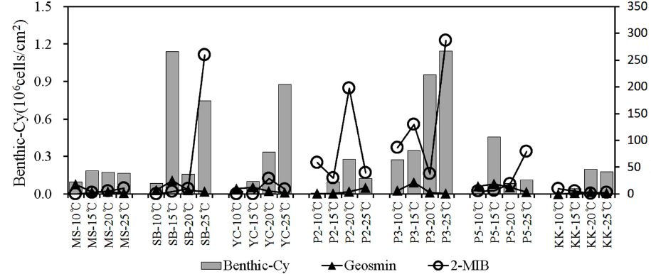 Oscillatoria tenuis와 O. limosa는 이취미 원인종으로(Jüttner and Watson, 2007), 두 종의 남조류의 현존량이 높았던, SB의 25℃, P3의 15℃와 25℃ 조건에서 2-MIB농도가 129.4~286.8 ng/L의 범위로 매우
