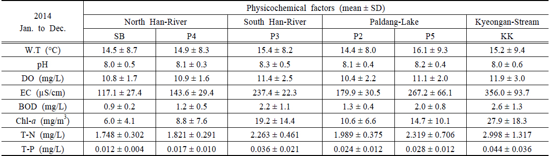 조사지점의 이화학적 수질은 앞에서 제시한 수질측정망자료(MOE, 2014)를 활용하였으며, 북한강의 경우 삼봉(SB)지점과 양수철교(YC)지점에 인접한 P4(한강물환경연구소 앞)지점의 자료를 활용하였다(Table 1). 연평균 수온은 14.5±8.7~16.1±9.3℃의 범위로 P5지점에서 약간 높았으며, 2014년 10월 6일 퇴적층 채집 시 20.2~20.7℃의