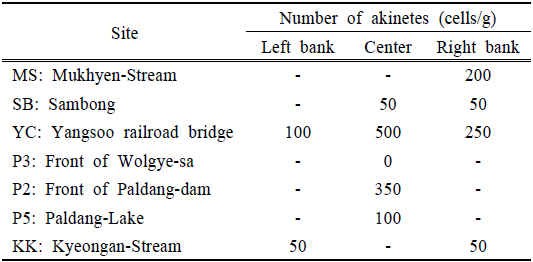 Distribution of akinetes in North Han-River (MS, SB, TC) South Han-River (P3), Paldang-Lake