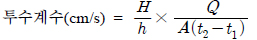 투수블록의 투수계수 측정방법은 제작된 틀 상부에 물을 넣어 일정한 수위차에서 10분간 투수되는 물의 양을 측정하였으며, 투수계수는 다음 식에 의해