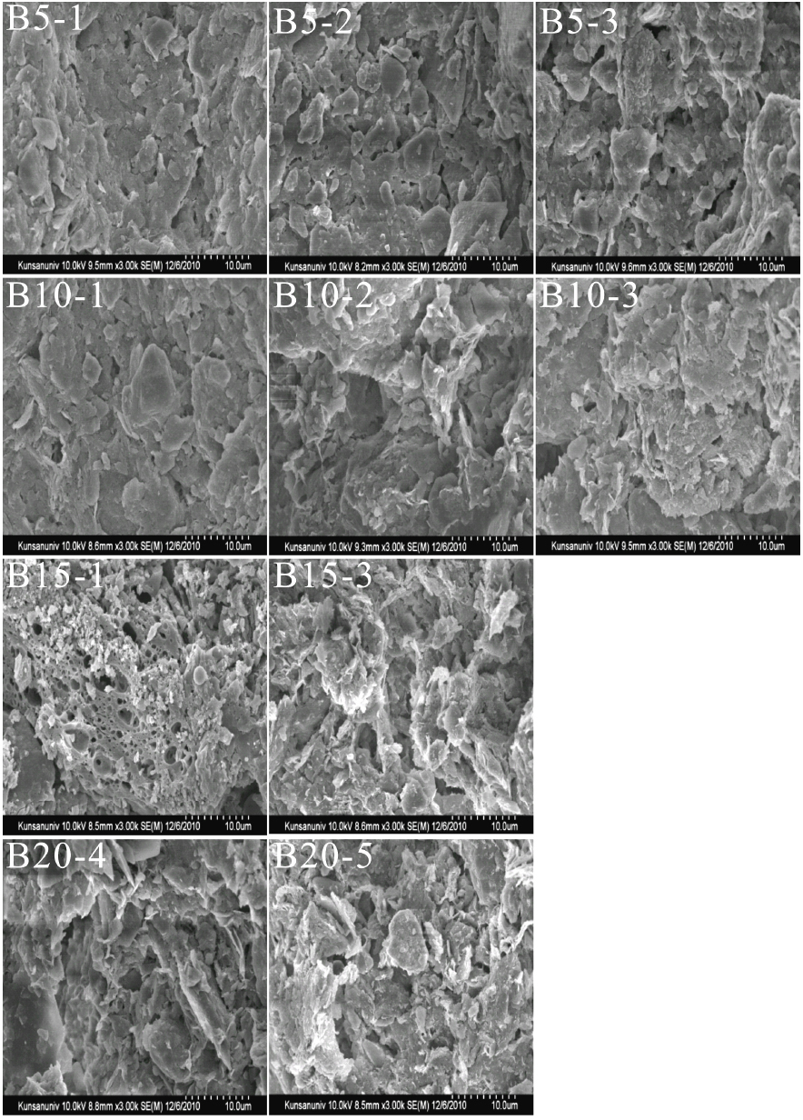증가하며, 표면 및 결합 구조가 복잡하게 형성되어 있는 것을 볼 수 있었다. 이는 오니 비율이 증가할수록 소성과정을 통하여 투수블록 내 오니성분이