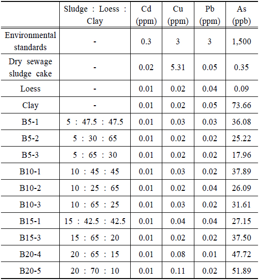 환경기준을 초과하는 농도를 보이지는 않았다. 황토는 모든 항목에서 낮은 농도를 보였으며, 점토의 경우는 As가 73.66 μg/L로 가장 높은 농도를